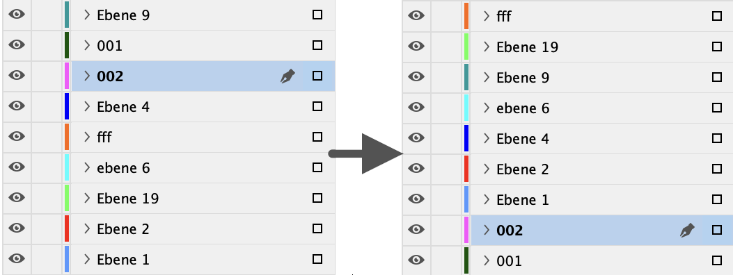 Sortiere alle Ebenen des aktuellen Dokumentes absteigend nach ihren Namen. Groß/Kleischreibung wird bei der Sortierung ignoriert. Hier ein Vorher/Nachher-Screenshot: